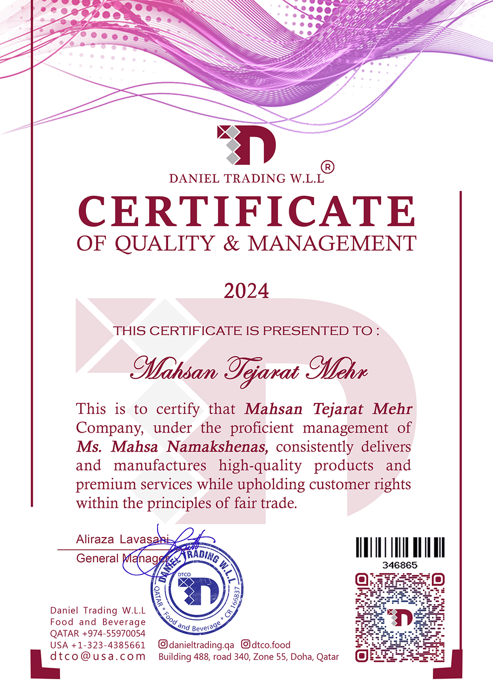 Mahsan Tejarat Mehr Company was established in 2016 with the aim of exporting high-quality Iranian food products and meeting the demands of international markets. As a leading trading company, we are committed to values such as responsiveness, trust, and quality. At Mahsan Tejarat Mehr, we leverage specialized units in market research, transportation, quality control, and advertising to provide comprehensive and professional services, fostering long-term and effective relationships with our customers.